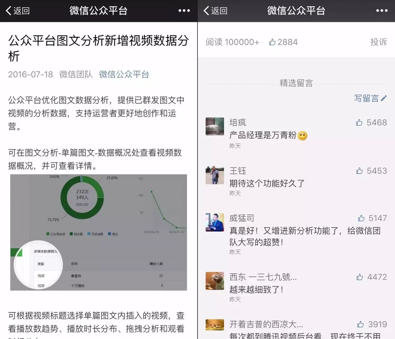 昨晚10:26,公众号“微信公众平台”发布了视频数据分析的上线公告。在这个公告的图文评论区,很多用户对视频数据分析功能表达了应有的热情:“视频制作者终于有个清楚明细的数据库了!”