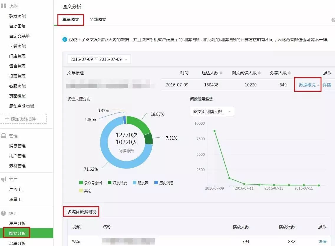 说这视频数据分析功能的入口藏得深,绝对不是假话!如果你想查看微信图文内嵌视频的播放数据,你至少需要右键点击3次,打开页面的路径是这样的:图文分析—单篇图文—多媒体数据概况。如果你想查看视频数据的详情,那还需要再额外点击1次。对后台不熟悉的小伙伴如果晕了,请看下图: