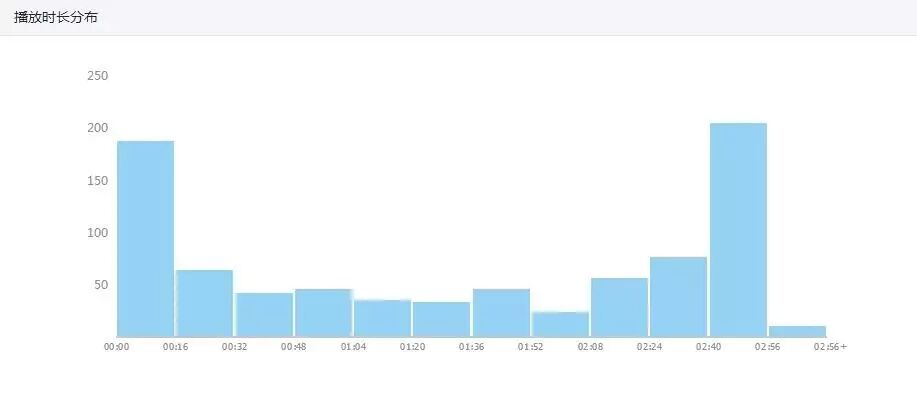 视频播放时长分布柱状图,可显示精准到xx秒播放时长的具体播放次数,这可以帮助运营者算出播放完成率等情况。