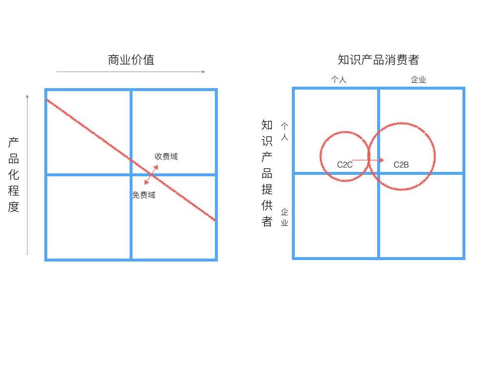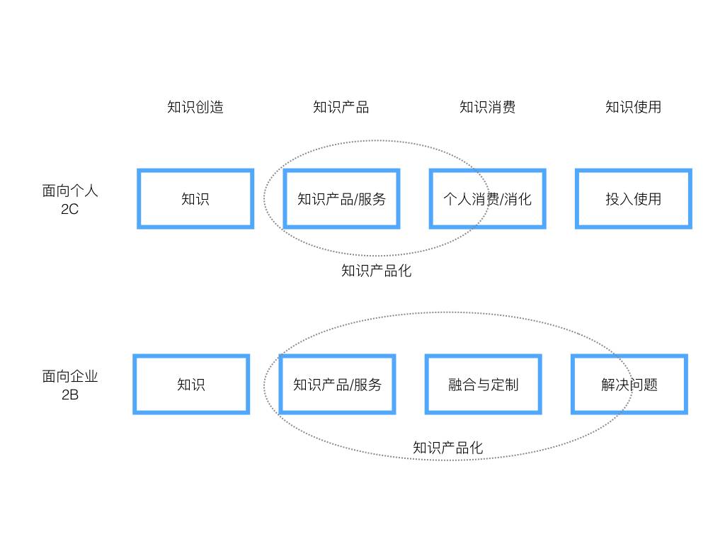 目前较为热门的互联网知识产品,还都是面向个人的(所谓2C),还没有涉及面向企业(所谓2B)。这也符合互联网发展的规律,面向个人的互联网产品规模(2C)目前远大于面向企业的产品(2B),互联网、移动互联网的企业服务领域近年来才开始大规模发展。面向个人消费者的产品,因为和个人相关,往往较易吸引关注,个人也比企业更容易接受互联网创新产品。