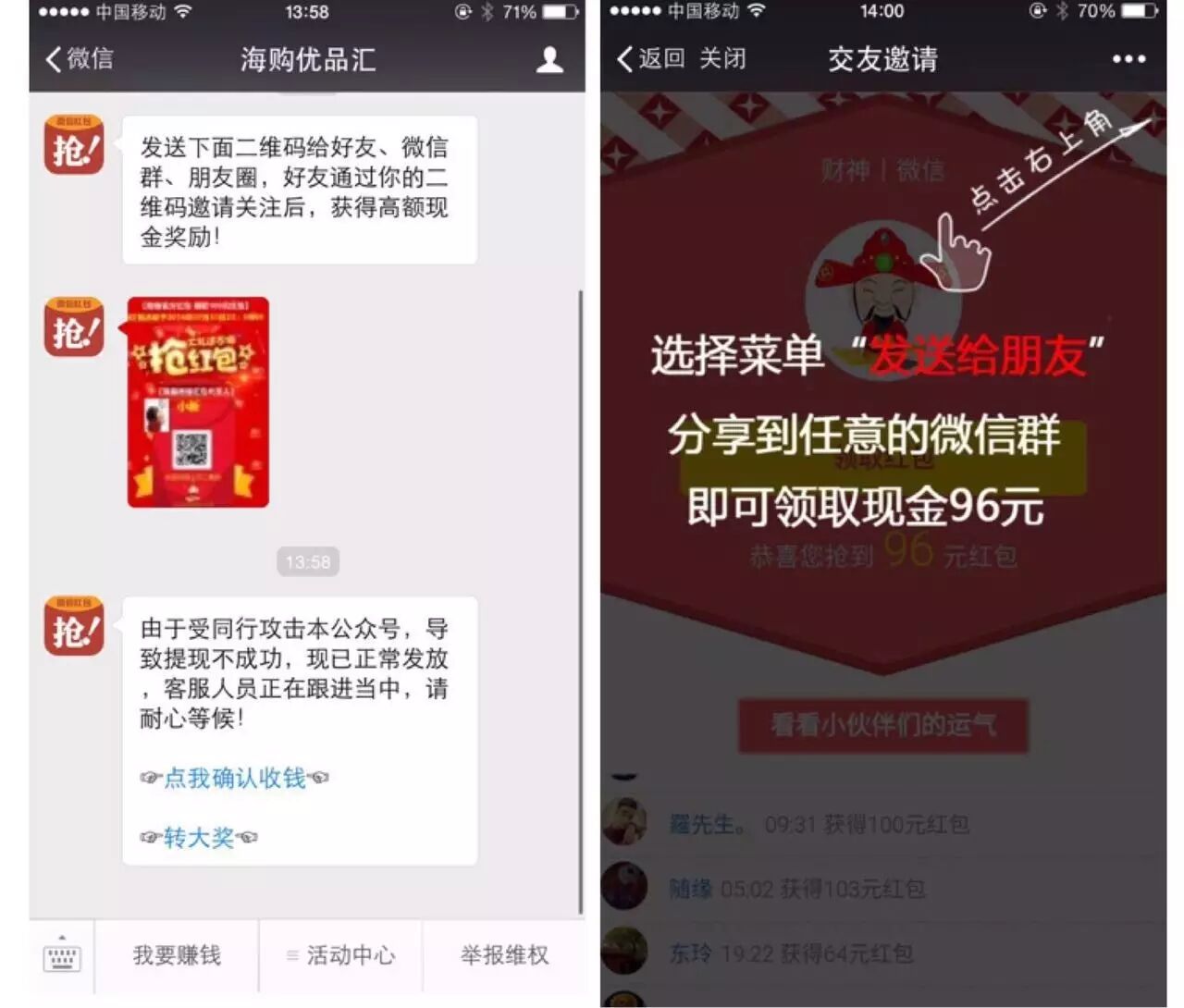 据新榜中国微信500强爆料,今天,“生活精选部落”“海购优品汇”等公众号推送消息,将带有二维码的图片转发给好友、微信群或朋友圈,好友通过二维码邀请关注后,即可获得高额现金奖励。
