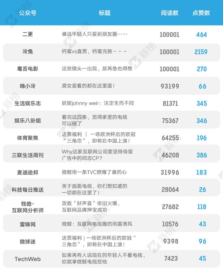 除此之外,微鲸在多个微信大号上投放了相关软文,根据新榜的文章搜索,不完全统计,在文章中带有微鲸电视最新广告视频的软文共有14篇,其中有三篇文章阅读数达到了10w+。
