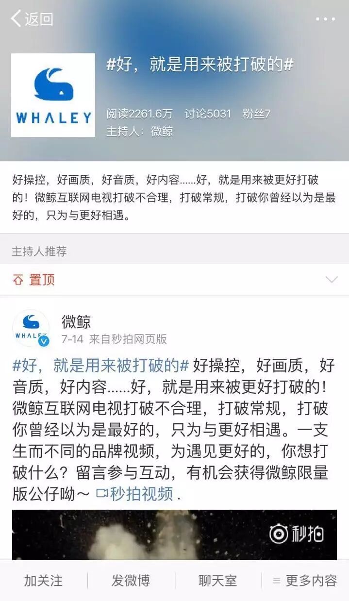 在《中国新歌声》第一集首播的当天,微鲸电视推出了最新的TVC广告:好,就是用来被打破的。微鲸自己形容这支广告为“生而不同的TVC”,在开头20秒时间内展示6次爆炸,音响、遥控器等全部打破,得到全新与众不同的微鲸电视。