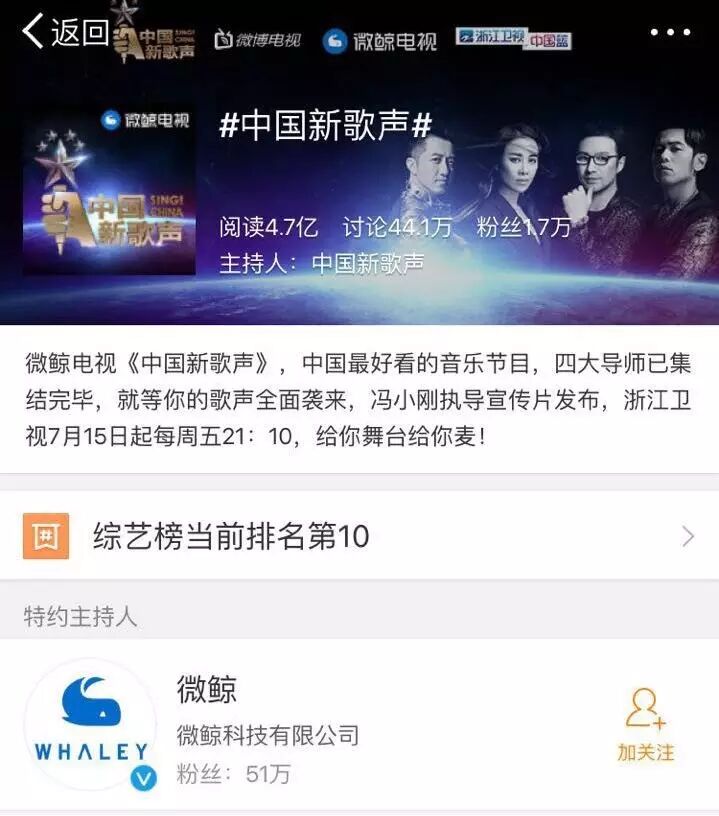 此外,在《中国新歌声》重新出发的当口,微鲸强势加入,不仅在技术和平台上提供大量支持,微鲸的品牌也多次登上微博热搜榜,网友们对微鲸的品牌有了更生动的认识。