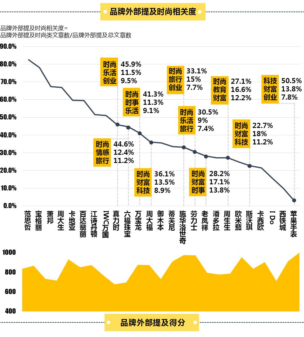 但是,数据表明,各个品牌的时尚相关度与外部声量并无明显关联。