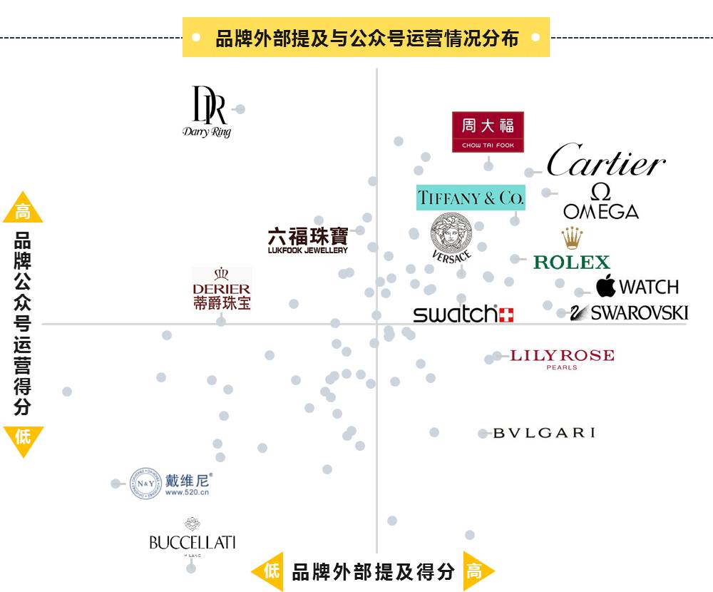 卡地亚、欧米茄、蒂芙尼、劳力士、周大福在品牌公众号运营和外部提及两个维度的表现都十分优异。