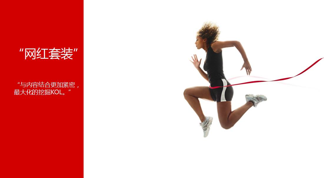 2档火爆短视频栏目,50+直播网红,100+微博KOL,“网红套装”的口号就是营销也性感!段子、视频、直播,三种传播介质就是三种传播利器。绿茵场上的大长腿和镜头前的锥子脸相映成趣,无论什么品牌,总有一种组合能惊艳你的用户。