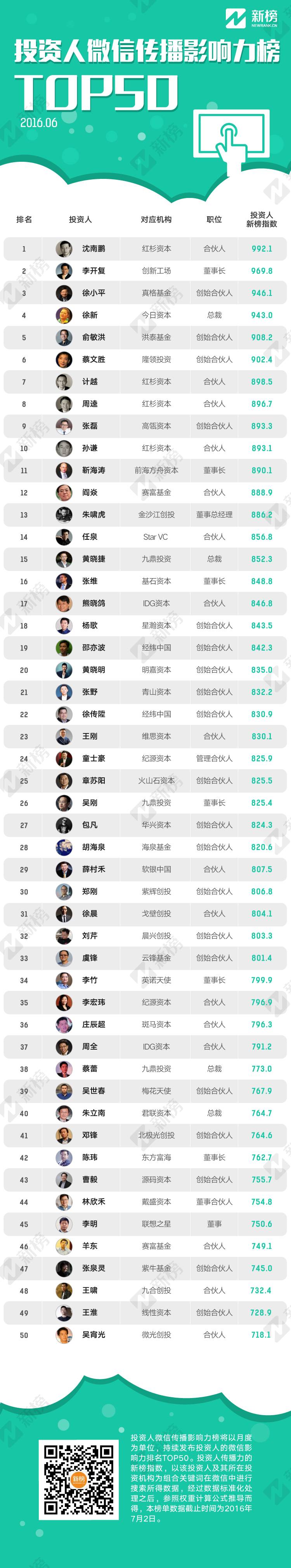 第一期投资人微信传播影响力排行榜,我们列出了排名前50的投资人。位居前三的分别是红杉资本沈南鹏、创新工场李开复以及真格基金徐小平,恰好是5月投资机构榜前三甲的创始人,可见投资人本身对于机构品牌传播力影响之巨大,这或许也是我们单独推出投资人传播影响力榜单的意义所在。
