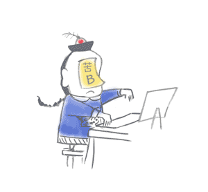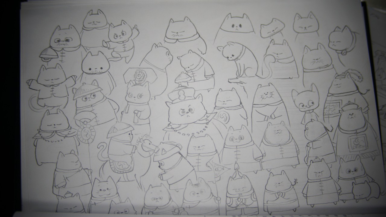 眼镜男在画画,我凑近一看,他在一摞用过的A4纸背面,用铅笔画了一百多只穿着侍卫马褂的猫,但其实都是开会时被毙的作品。