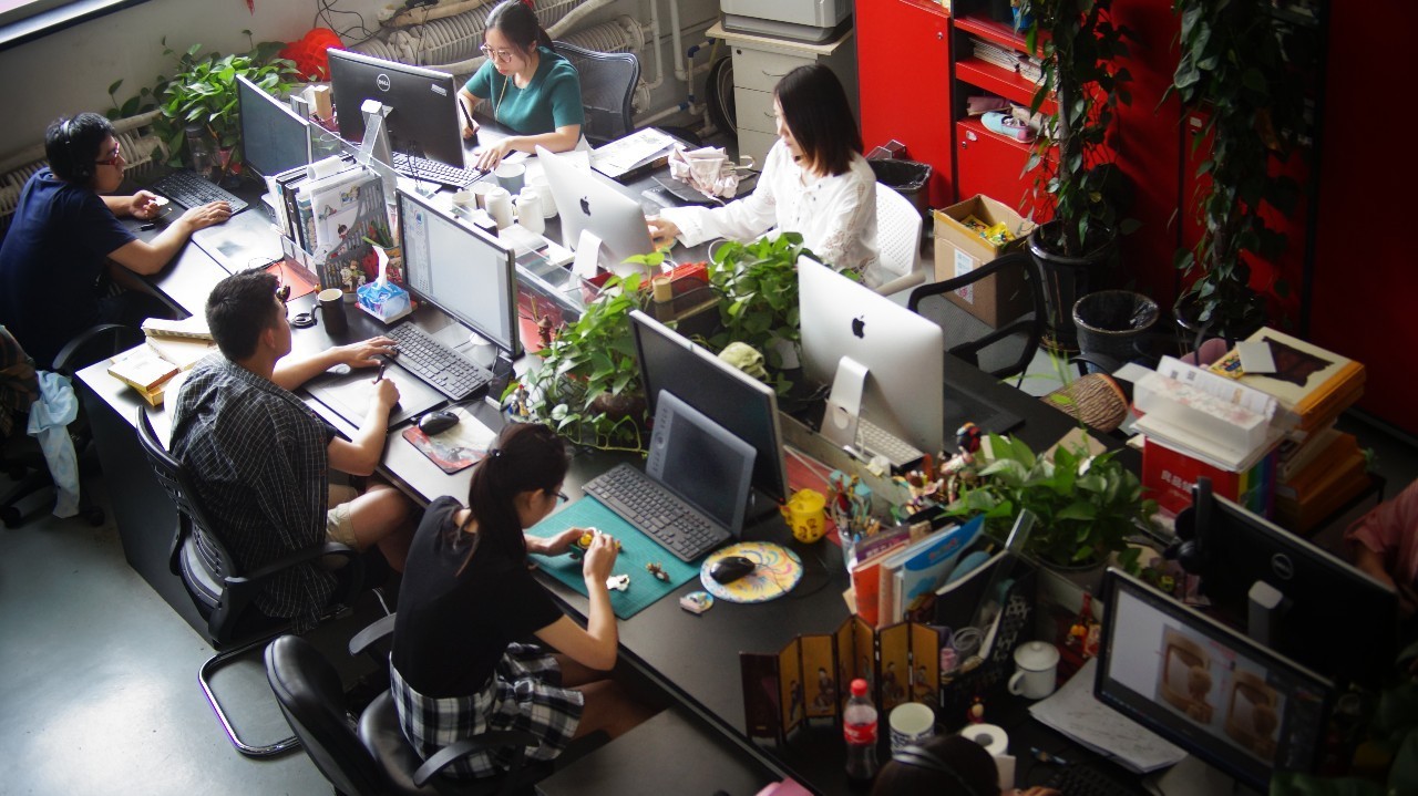 她随手指了一个埋头画画黑黑壮壮的眼镜男“他们负责深入严谨的那部分,我们负责浅出接地气的那部分”。眼镜男转头憨厚地笑笑。