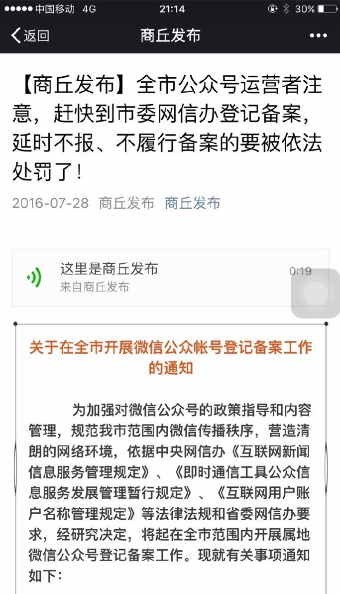 7月28日消息,商丘市发布《关于在全市开展微信公众帐号登记备案工作的通知》,通知要求,为加强对微信公众号的政策指导和内容管理,营造清朗的网络环境,依据中央网信办的法律法规和省委网信办要求,经研究决定,将起在全市范围内开展属地微信公众号登记。