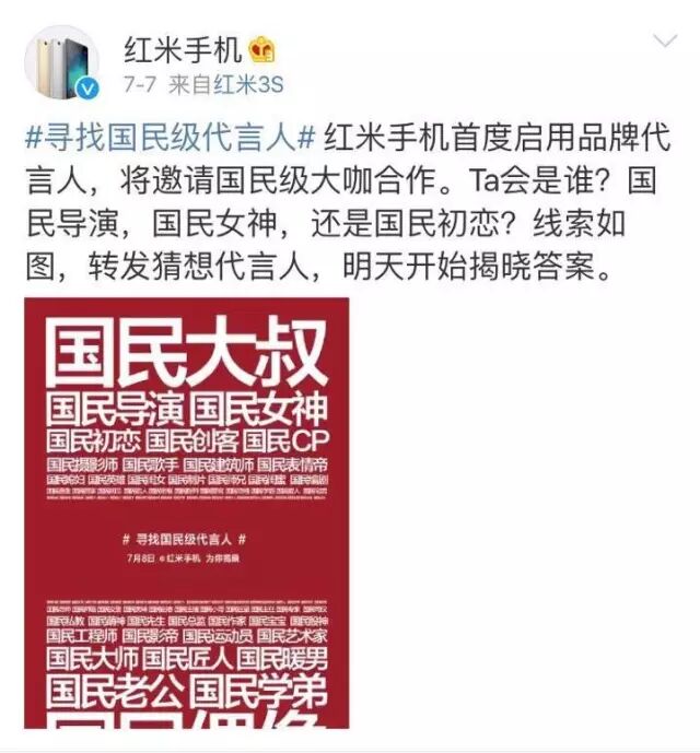 7月7日,红米手机通过官微宣布,红米手机将首度启用品牌代言人,邀请国民级大咖合作。这是小米首次宣布使用品牌代言人。