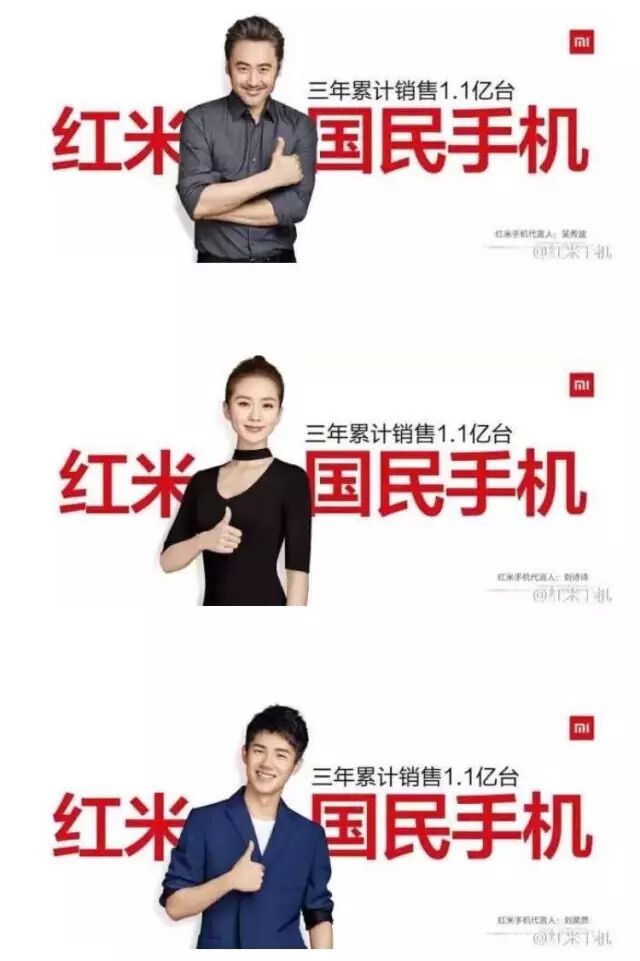 在接下来的几天内,小米利用一连串惯用的悬念营销手段,依次揭晓了三位代言人,国民大叔吴秀波、国民女神刘诗诗和国民学弟刘昊然。