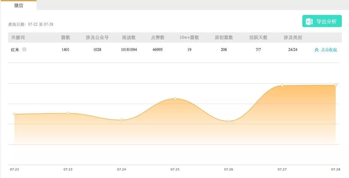除了以上这几个大号之外,红米手机在微信端的提及总量也不小,根据新榜趋势查询结果显示,近7天内,共有1028个公众号的1401篇文章提及红米,总体阅读量突破1个亿。而近30天,“红米”的搜索趋势也是一路上升。