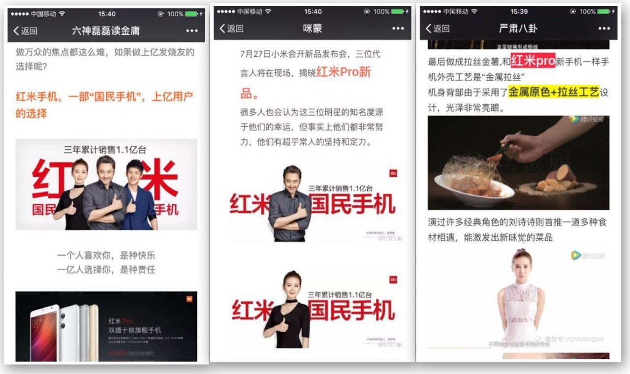 和以往营销主阵地在微博的情况不同,这次红米手机的营销,似乎更侧重微信端,在微信软文的投放上也投入了大量预算。