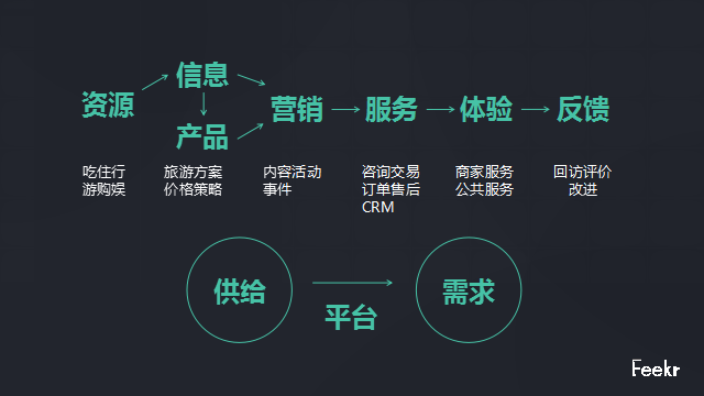 电商之战就是品类之战,所以如果要去做电商,首先要思考的就是你要卖什么?在旅游这个行业,几十年来,它的产业链本身没有太大的改变,从最早的一些资源端的吃住行游购娱,然后把这些资源端的信息进行重新的组合、包装,成为一个旅游的产品,通过营销,把这个产品推向给公众,到了线上线下的服务,来自用户的体验和反馈,整个链条没有发生变化。