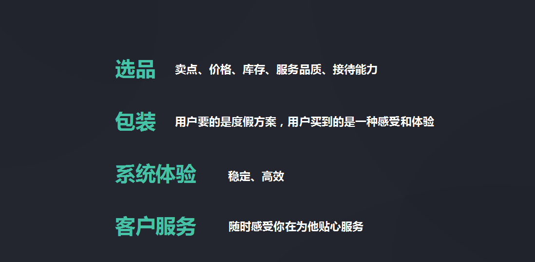 我们卖的是什么?通过内容的方式连接交易,卖的本质上不是一些项目,更多卖的是一种体验感,如何去把这种体验感能够更多的通过内容方式给到用户,让他去感知,这是内容电商最重要的表现手法和方式,也是最重要思考的问题。