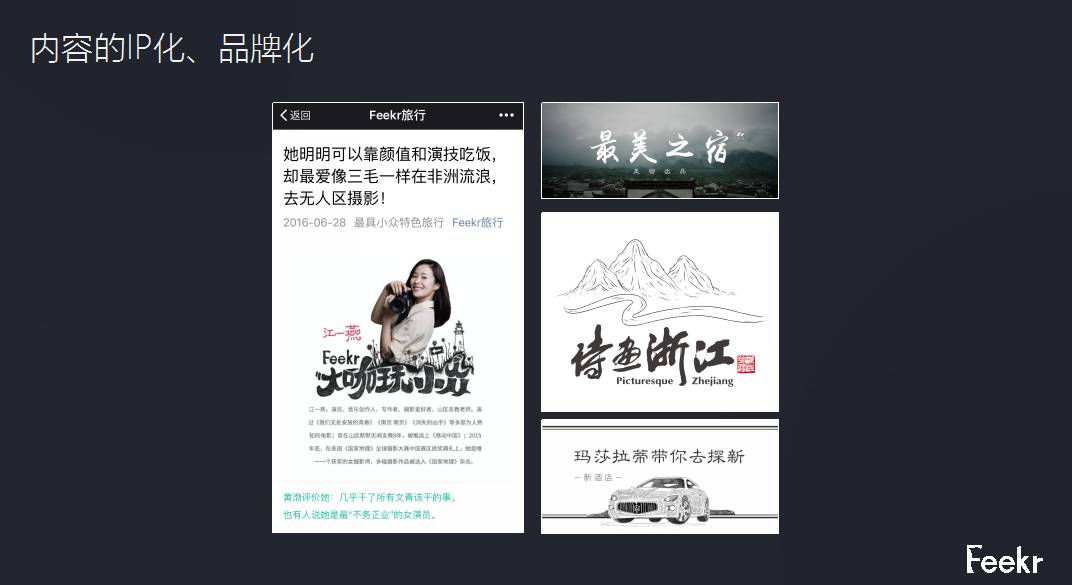 渠道的多样化,微信现在目前在Feekr只是其中很小的部分,大概只占了三分之一的流量,我们在其他全平台媒体上都会进行内容的分发,每周1200万左右的流量。