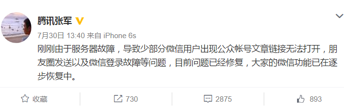 晚间,腾讯公关总监张军在微博就此次故障向大家“道歉”,表示“会坚持持续提高运维能力”,并指责一些公众号在此事上“无事生非”。