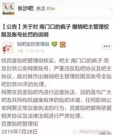 7月28日,百度贴吧发布公告,称百度贴吧的长沙吧、株洲吧、益阳吧、郴州吧等四个贴吧吧主恶意封禁公安网警账号被撤换。