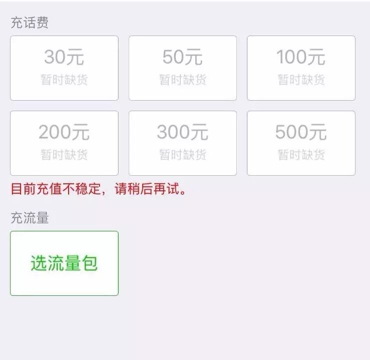 今天,不少网友表示用微信给手机充值会显示“缺货”,或者“目前充值不稳定,请稍后再试”。