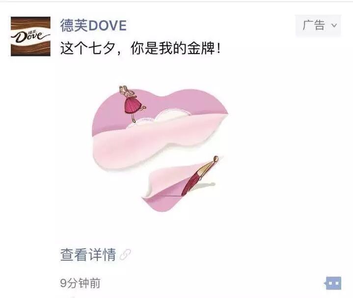 进入8月之后,德芙开始在微信朋友圈投放七夕主题广告。在这次投放的详情信息中,德芙制作了一支30秒的动画广告片。