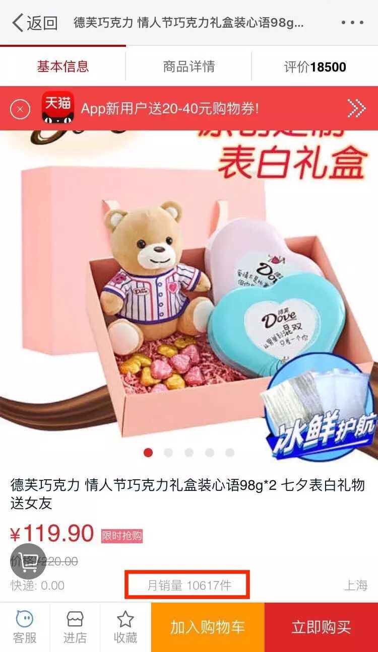 从效果来看,三篇10w+,最低的一篇阅读数也超过5万,应该可以说达到了理想的效果。而从德芙天猫旗舰店七夕礼盒的销售情况来看,月销量达到10617件,且绝大部分都是满满的带字好评。