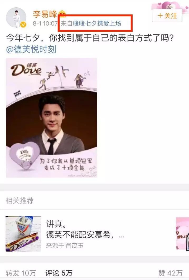 作为德芙的代言人之一,李易峰在微博上的一声号召引来了粉丝们的积极跟随。8月1日,李易峰在微博发布德芙专题图,并@德芙悦时刻 。这条微博获得了15万转评和42万多点赞。还有一个小细节,李易峰在发布这条微博的时候,将微博小尾巴改为了“峰峰七夕携爱上场”,这个小彩蛋也被粉丝们发现。