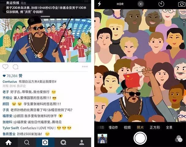 第三,紧跟奥运热点。这款H5的主题,最终落在了里约奥运会上,孔夫子坐飞机前往里约观看奥运会,孔子把照片上传了Instagram,并且将本次的活动主题#奥运我撑你#也作为标签植入,留言和点赞列表中,除了老子、齐桓公、颜回、子贡等孔子同时期的名人外,连张继科、福原爱等奥运名将也前来点赞,一举把孔子捧成了当代网红。