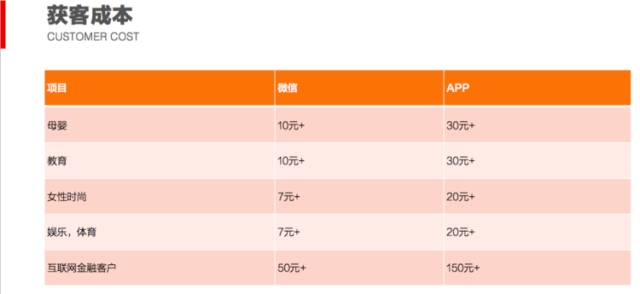 在微信和 App 的用户获取成本方面,互联网金融的客户是最贵的,平均在微信上拉新 1 名用户需要 50 元;母婴、教育为 10 元/位;女性时尚、娱乐、体育为 7 元/位。