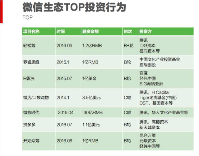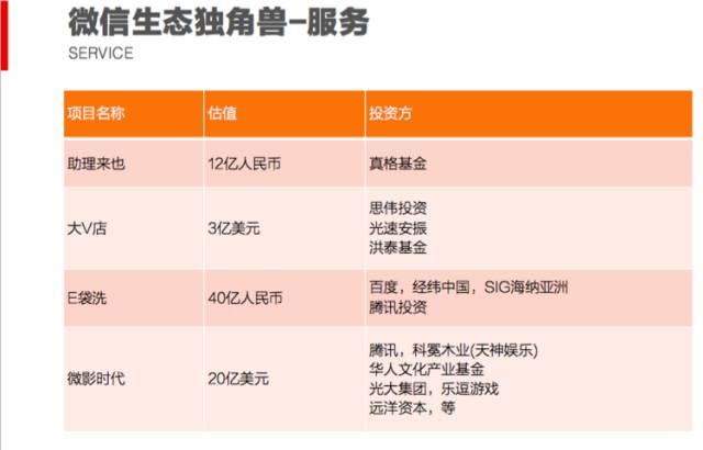 在微信的“服务”生态中,微影时代估值达 20 亿美元, E 袋洗(40 亿元)、大V店(3 亿美元)、助理来也(12 亿元)。