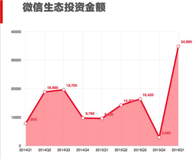 围绕微信生态(主要涵盖平台、媒体、服务)的投资的金额在今年一季度达到巅峰:34 亿 9 千万元(这里有一笔大额交易贡献者:微影时代,他们在今年 4 月获得了来自腾讯和华人文化产业基金等投资方 30 亿人民币的 C 轮融资)。