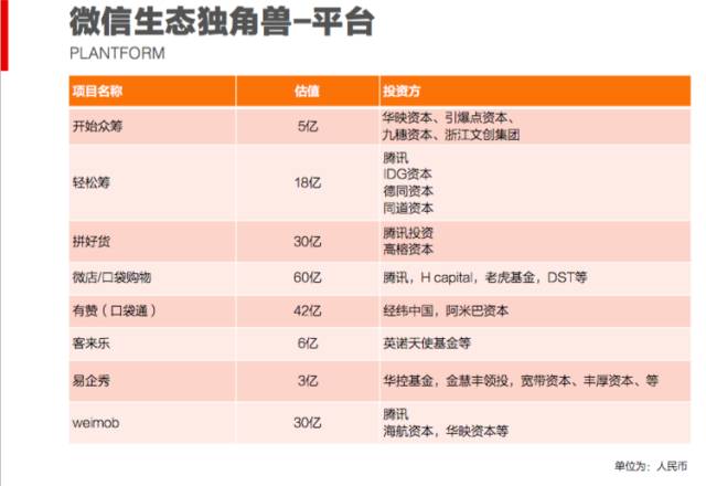 在微信的“平台”生态中值得期待的“独角兽”,是为微信用户提供服务链接的微店(60 亿元)、有赞(42 亿元)、拼好货(30 亿元)、weimob(30 亿元)等。
