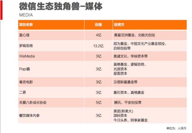 在微信的“媒体”生态中,罗辑思维的估值达 13.2 亿元,关爱八卦成长协会(5 亿元)、壹心理(4 亿元)等。