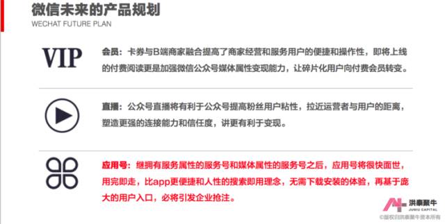 关于微信未来产品的规划,洪泰聚牛基金认为,会员(付费用户)、直播、应用号是最值得关注的三大方向。