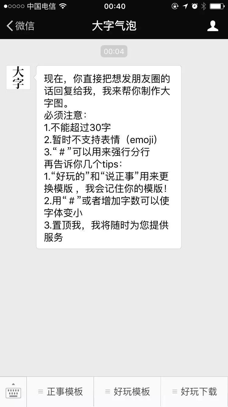 今天凌晨,“大字”的认证主体注册了另一个公众号“大字气泡”,继续开放大字朋友圈小游戏。但在随后,该号也相继被微信封号。