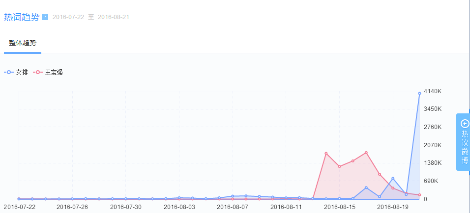 如果说前两天“王宝强”离婚在微博上的热度,已足够令人瞠目结舌。那么,通过这张“微指数”热词趋势的对比清晰显示,女排决赛和夺冠带来的全民热议,已远远高过巅峰时段大家对宝强离婚的关注。
