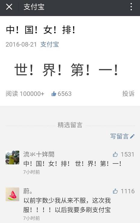 当数网友还沉浸在夺冠的激动情绪中,当大多数小编还在整理女排素材的时候,“支付宝”已经凭借正文内容仅有4字的“世界第一”,赢来又一个华丽的10w+,摘要仅3字:“还!有!谁?!”
