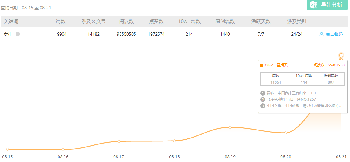 通过新榜后台监测的数据,过去一周,提及“女排”的微信公众号推文近2万篇,有1440篇原创,产生了214篇10w+爆文,点赞数超过197万,足以彰显“女排”的强大影响力。
