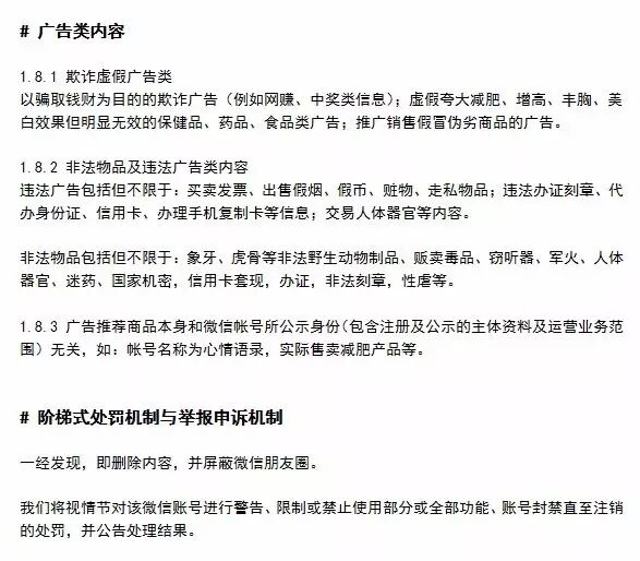 而去年3月15日,微信团队也发布了《微信朋友圈使用规范》,旨在规范用户的朋友圈使用行为,其中明确界定各类违规现象,并形成正式、公开的处理准则。其中对广告相关内容的约束如下: