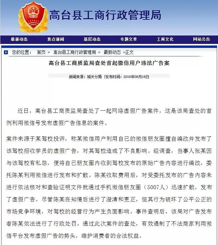 近日,甘肃省张掖市高台县工商行政管理局在官网公布了一则“高台县工商质监局查处首起微信用户违法广告案”的公告。公告显示,一位朋友圈好友人数5007人的微信用户,收取费用后,在朋友圈发布了一条有关某驾校的广告,该广告最终被证实为虚假广告,涉案驾校投诉后,高台县工商行政管理局对虚假广告发布者进行了行政处罚。