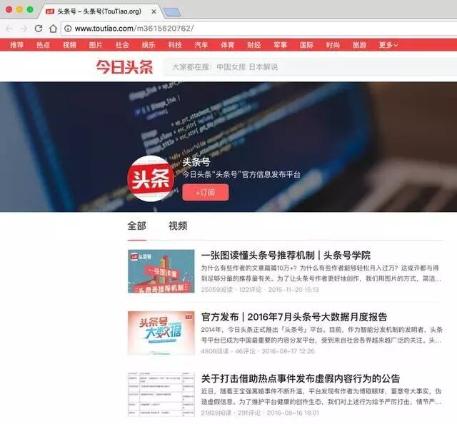 点击广告素材,可以直接跳转到所推荐头条号的主页。