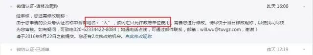近日,有运营者反映,公众号的命名规则发生了变化,昵称中含有地名+“人”的公众号无法进行认证。 在提交公众号年审时,提示信息显示,其昵称是由地名+“人”组成的,所以不能通过。根据通知,地名+“人”的词汇只允许政府单位使用。 - The End - 以上内容使用新榜编辑器发布。新榜编辑器,多平台一键分发、海量在线图片搜索、大数据帮你了解“什么值得写”、丰富的样式中心,可能是全中国最好用的编辑器。 | 新榜热文 | 卖公众号 | 大字被封 | 玩车教授 音乐号涨粉 | 罐头视频 | 宝强离婚 X博士 | 传媒老炮 | 洪荒之力 逆流涨粉 | 付费订阅 | 奥运热点 买神黎贝卡 | 潮生活 | 动图不动 硬腿子视频 | 身体被掏空 | 大话铲屎 陈冠希骂人 | 凤姐开公号 | 故宫卖萌 朋友圈故障 | 真实故事计划 | 何仙姑夫