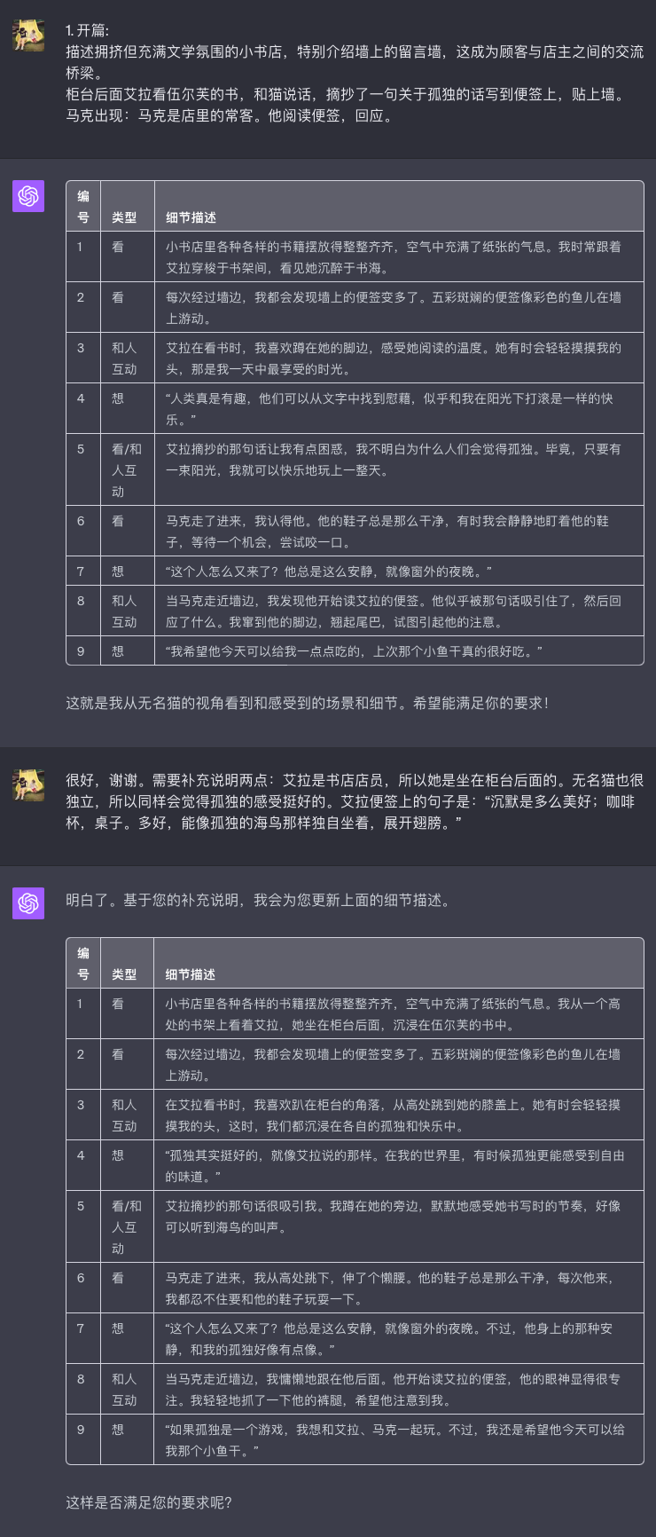 随后的这些天,每当店门响起,艾拉都会期待地抬起头。那一刹那,她的眼中总带有一丝盼望。但很快,她又会失望地低下头,仿佛害怕再次面对心里的期待。我常常看到艾拉站在那些旧便签前,目光沉默而持久。我蜷缩在角落,心想:“她在想他。我真的希望他们可以在一起。”
