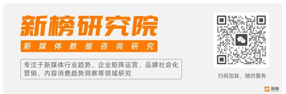 • “新媒体,找新榜”是我们的使命。凭借全面稳定的新媒体内容数据产品和企业服务能力,新榜被评为国家级高新技术企业、上海市专精特新企业、上海数字广告领军企业,曾荣获“全国内容科技创新创业大赛一等奖” 、“上海文化企业十佳”、“中国广告新媒体贡献年度大奖”等称号,拥有多个传播评估监测专利。浏览器搜索新榜官网,获取更多新媒体动向。