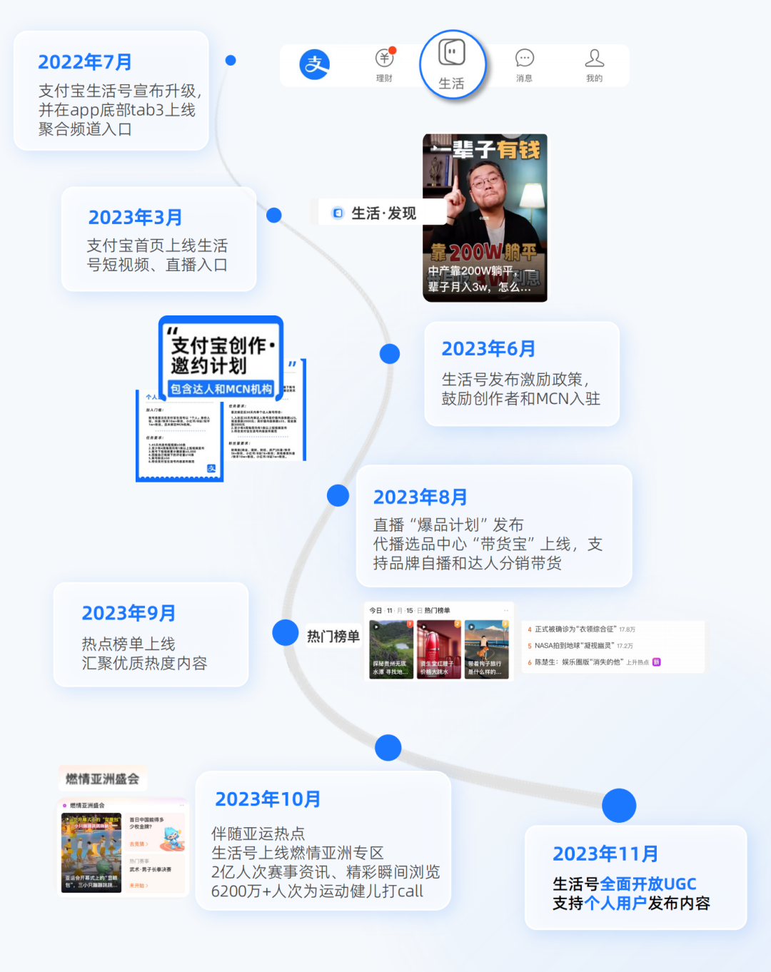 2022年7月,支付宝在App底部Tab栏上线“生活”频道,聚集生活号的短视频和图文内容。今年11月,支付宝宣布开放UGC入口,支持个人用户在线编辑、发布内容。至此,支付宝已经完成了在内容领域的试运营和填充蓄水,进入大门打开的全新阶段。