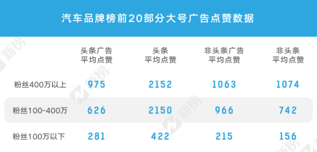 下面,我们分析了部分汽车微信大号的头条广告发文和头条平均发文的传播数据: