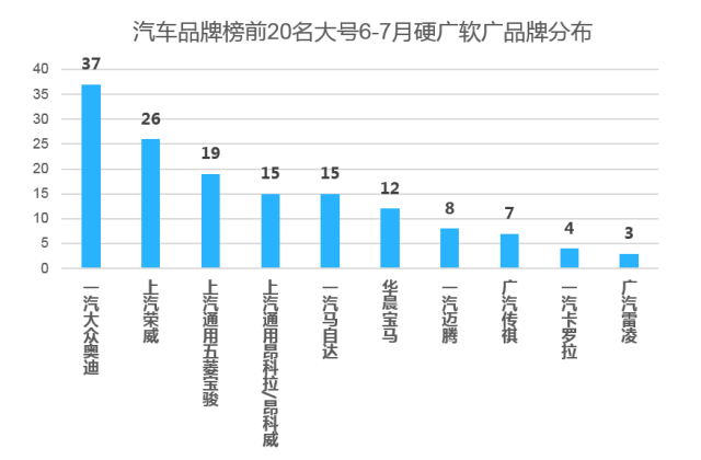 在汽车广告主里,最热衷于在汽车大号投硬广软广的是上汽集团。广告数量高达68条,相当于汽车大号6-7月中,10.6%的硬广软广都是上汽投放的。而投放硬广软广最多的汽车品牌是奥迪,数量是宝马的三倍以上。