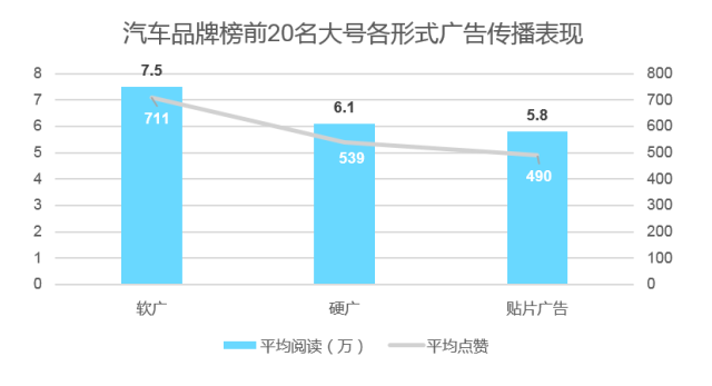 从广告效果来看,软广传播效果最好,文章平均阅读7.5万,平均点赞711;硬广平均阅读6.1万,平均点赞539;贴片广告效果一般,平均阅读5.8万,平均点赞490。