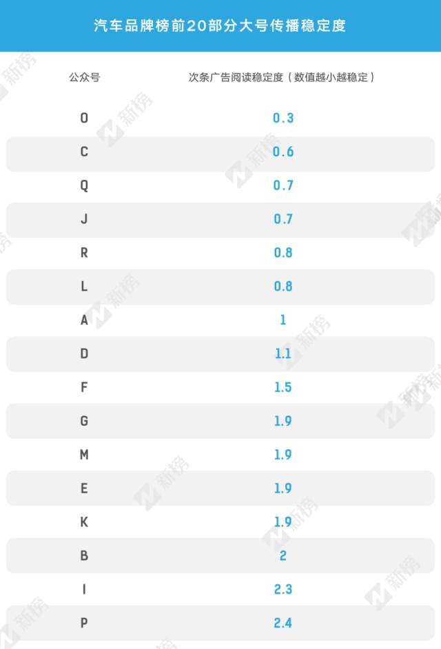 除了传播力,广告主选号其次要判断公众号广告的传播稳定性。对于广告主来说,投放前需要对广告传播情况有一个大致的预期,而阅读数起伏大的公众号不太利于整体投放规划。通过下图,我们可以发现一些稳定度相对较高的公众号。(由于汽车大号的头条阅读数多为10万+,所以这里选取它们的次条广告阅读数进行分析)